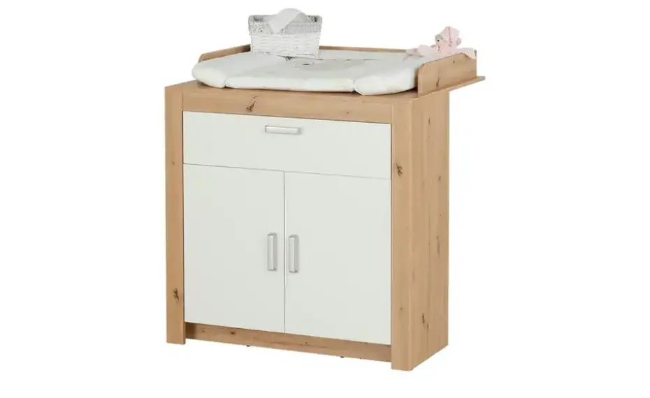 Diese Möbelserie verbindet zeitloses Weiß mit einer authentischen, natürlichen Nachbildung in Eiche Artisan. Die Wickelkommode der Serie wirkt dadurch natürlich und modern zugleich. Verstauen Sie Baby- und Wickelzubehör in zwei geräumigen Fächern hinter der Doppeltür. Kleinkram findet im Schubkasten problemlos Platz. Der mitgelieferte Wickelaufsatz ist in authentischer Eiche-Artisan-Nachbildung gehalten und passt perfekt zum Korpus der Kommode. Unser Tipp: Nutzen Sie den Platz hinter der Wickelkommode für Windelpakete, Spielzeugkörbe und Mehr.