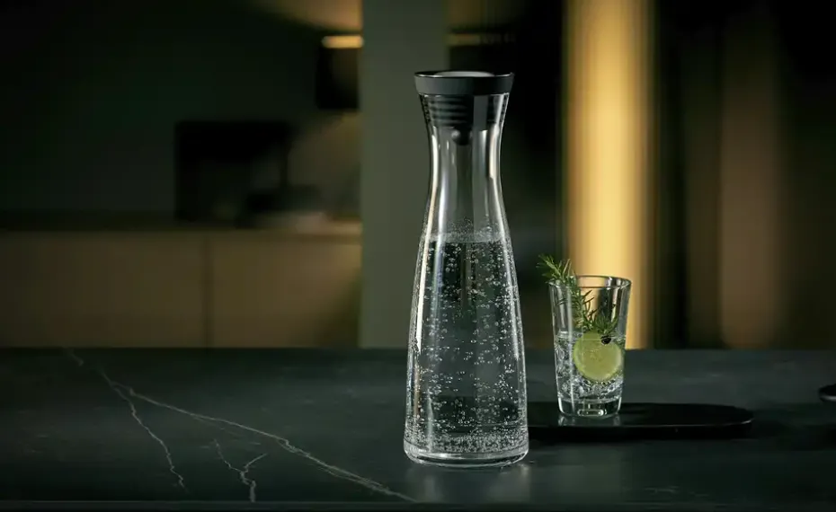Schlank und schlicht ist die gläserne Wasserkaraffe von WMF eine Bereicherung für jeden Haushalt. Der Deckel aus Cromargan® und Kunststoff besitzt eine automatische Verschlusstechnik, die funktionell und formschön ist.