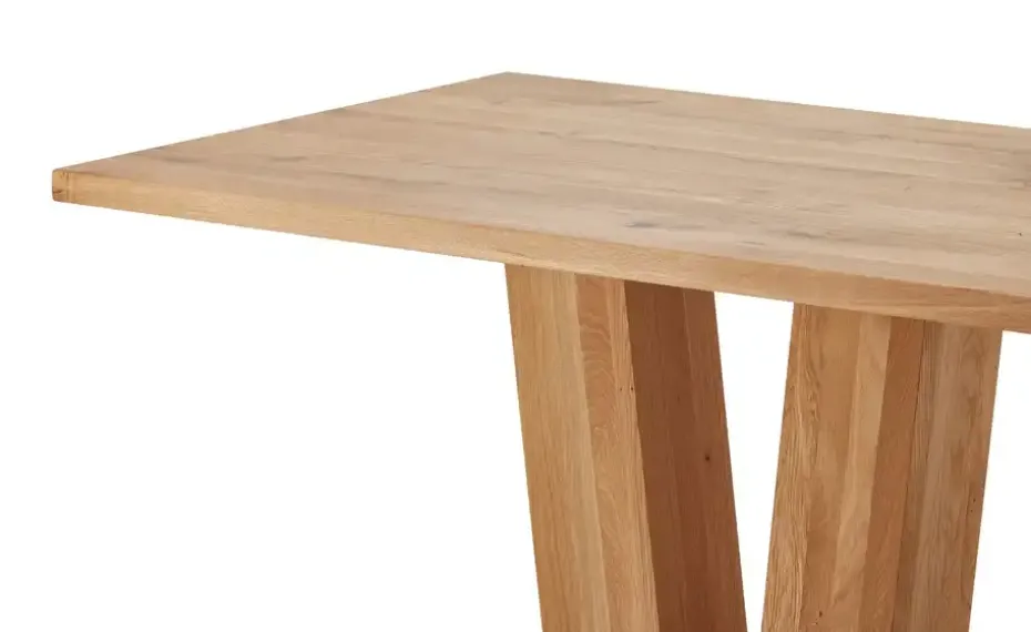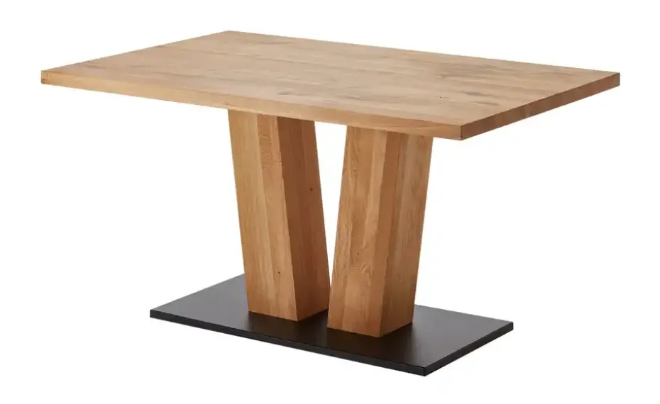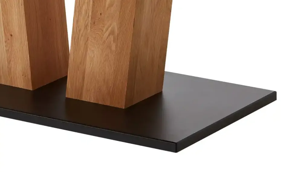 Tischplatte und V-Säule aus Charakter-Eiche massiv geölt, Bodenplatte: Schwarz lackiert