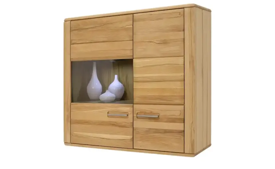 Wie der Name schon erahnen lässt, bietet das Hängeelement Dio Stauraum an der Wand. Der Stauraum wird von zwei Drehtüren vor Staub geschützt. In einer Tür befindet sich eine Absetzung aus bräunlichem Parsolglas. Durch dieses können Sie in das große Fach innen schauen. Somit bietet sich dieses als Vitrinenfach an. Insgesamt stehen Ihnen sechs Fächer zur Verfügung. Dio hat durch die Verwendung von Echtholz einen natürlichen Charme. Der Korpus ist furniert, die Front besteht aus Massivholz. Die Metallgriffe setzen Akzente.