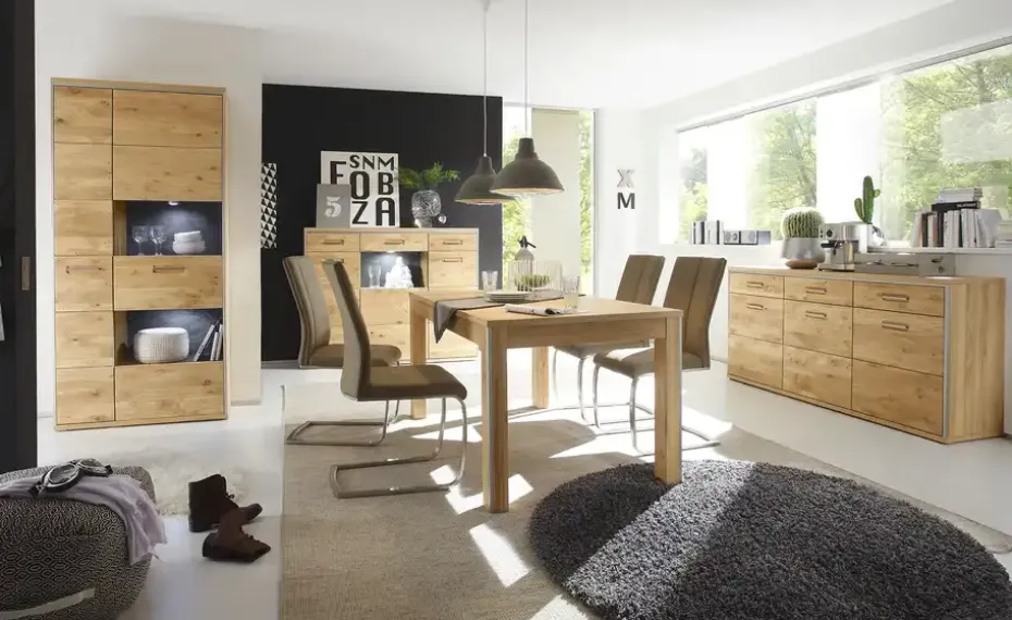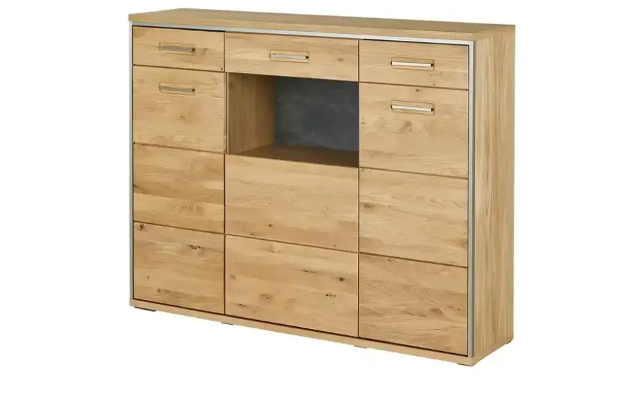 Das Highboard Felino ist mit drei Türen sowie zwei Schubkästen ausgestattet. In der oberen Mitte gibt es ein offenes Fach. Hinter den Türen befinden sich jeweils zwei Einlegeböden, die dafür sorgen, dass Sie Gegenstände und Accessoires sicher und ordentlich unterbringen können. Die Oberseite des Highboards können Sie ebenfalls als Ablagefläche oder zum Präsentieren dekorativer Gegenstände nutzen. Dank ihrer natürlichen Optik kommt die Kommode in Ihren Wohn- und Schlafräumen gut zu Geltung. Die silberfarbenen Griffe runden das Erscheinungsbild des Möbels auf gekonnte Weise ab.