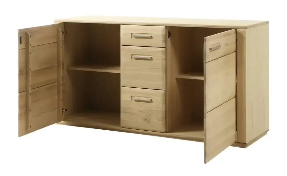 Zum Aufbewahren von Geschirr, Fotoalben oder Kleidung – das Sideboard Dio bietet viel Platz. Links und rechts hat es jeweils eine Tür mit je drei Fächern dahinter. Mittig stehen Ihnen zwei große und eine kleine Schublade zur Verfügung. Die Schubkästen sind mit einem Softeinzug ausgestattet, so dass sie geräuscharm schließen. Die Fronten von Türen und Schubfächern bestehen aus geöltem Massivholz. Der Korpus ist mit dem gleichen Holz furniert. So ist ein einheitlicher, natürlicher Look entstanden.