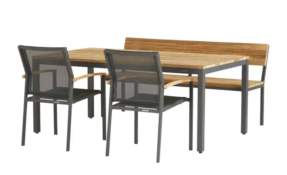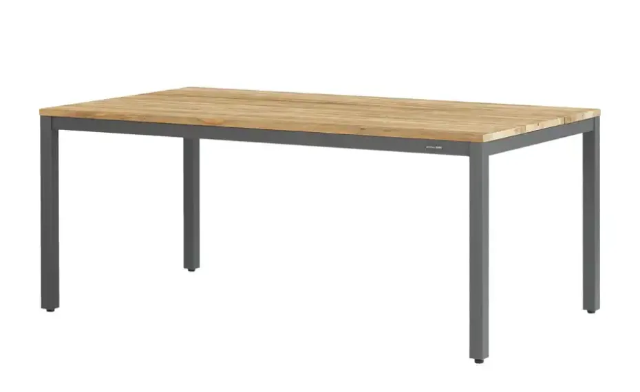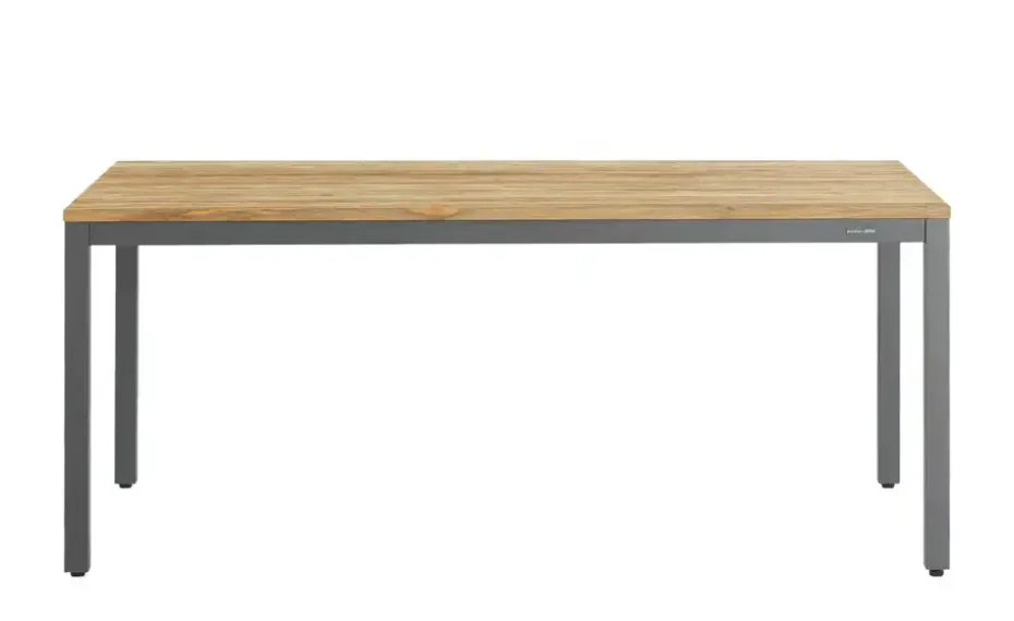 Beim Tisch Alex sind Nachhaltigkeit, Wetterfestigkeit und Design harmonisch im Einklang. Das auffällig gemaserte Teakholz wurde recycelt und ist nun das Highlight der 180 x 100 Zentimeter großen Tischplatte. Getragen wird das massive Echtholz von einem robusten Gestell aus pulverbeschichtetem Aluminium. Die Tischplatte befindet sich auf einer Komforthöhe von 75 Zentimetern und passt dadurch zu zahlreichen Outdoor-Stühlen und -Bänken. Übrigens: Besonders gut lässt sich der Esstisch Alex mit der gleichnamigen Gartenbank kombinieren.
